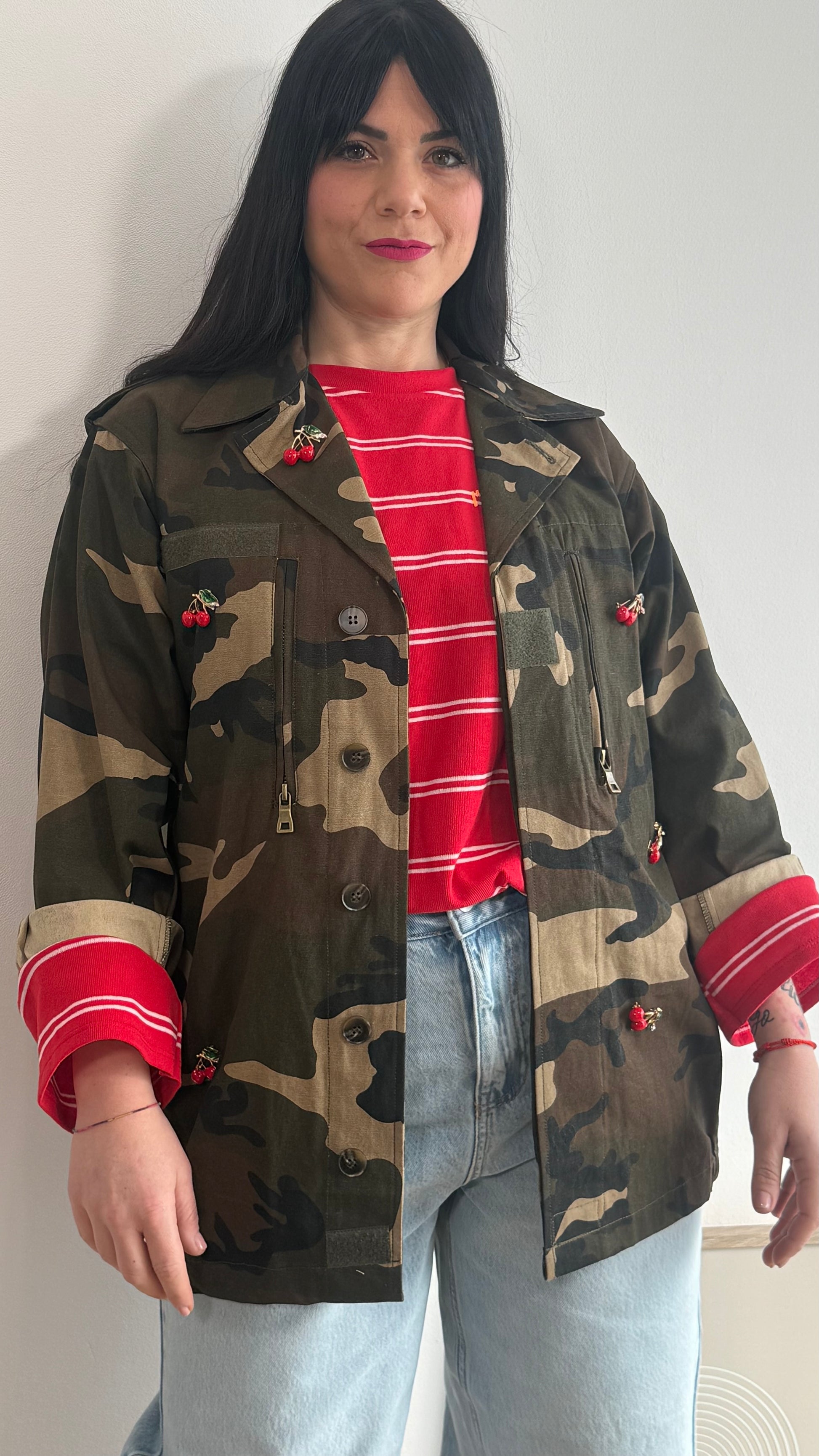 Giacca a taglie con spille con le ciliegie applicate e rimovibili