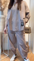 Il pantalone con elastico in vita e tasche applicate, lunghezza alla cavilglia con il fondo con chiusura a bocciolo